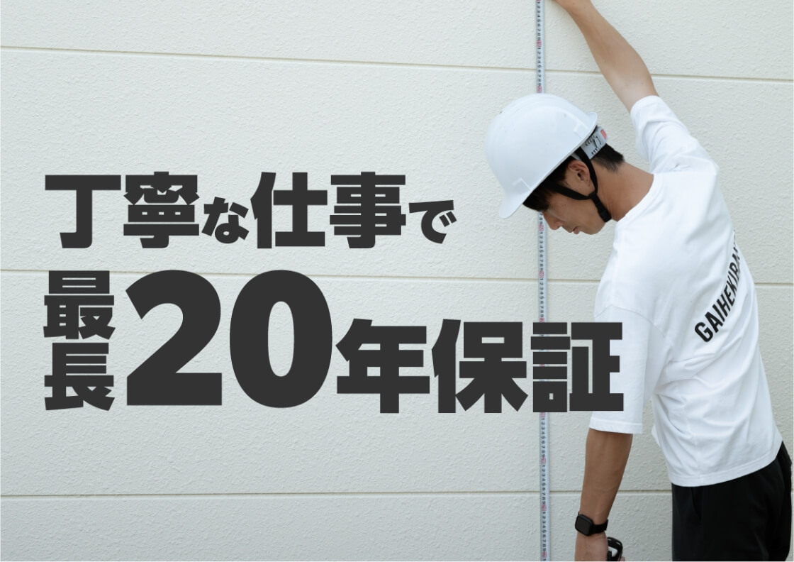 【丁寧な仕事を行う】このポリシーを皆様と約束するべく、最長20年間の工事保証を行います。 外壁塗装、屋根工事は外壁番長にお任せください!