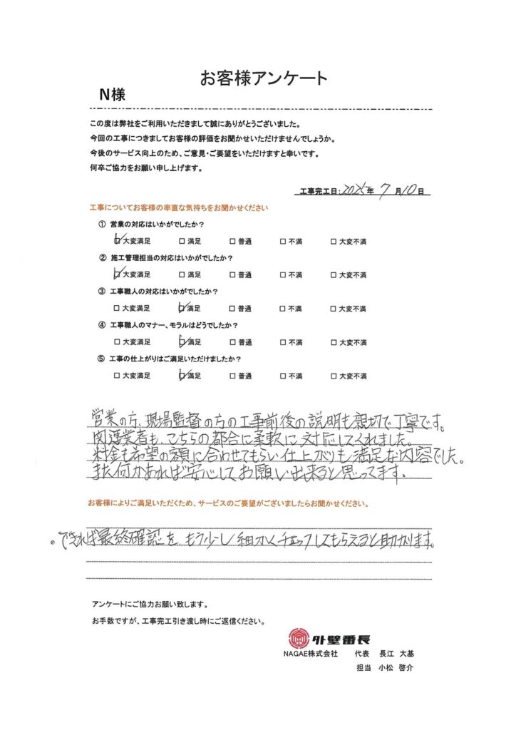 営業の方、現場監督の方の工事前後の説明も親切で丁寧です。関連行者も、こちらの都合に柔軟に対応してくれました。料金も希望の額に合わせてもらい仕上がりも満足な内容でした。また何かあれば安心してお願い出来ると思ってます。